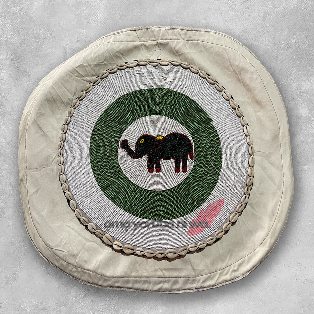 Bordado con cuentas y confeccionado a mano por artesanos de Òyó (Nigeria), cada pieza combina firmeza y detalle visual. Algunos modelos incluyen figuras representativas como el elefante, símbolo de fuerza y presencia.
